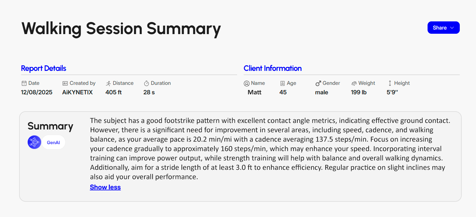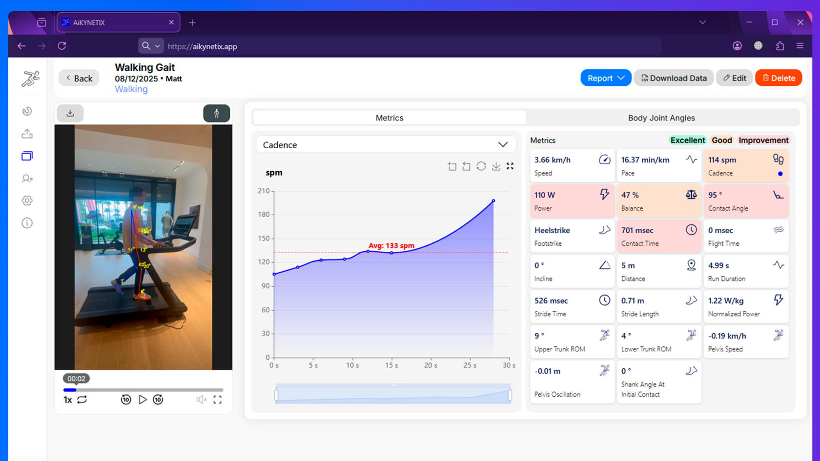 AiKYNETIX’s web platform makes these mechanisms measurable from standard video. For walking, it reports session outcomes (speed, pace, cadence, power), mechanics indicators (contact time, stride timing/length, footstrike), and stability/efficiency signals (balance and contact angle). Used consistently, this metric set supports rapid screening, progress tracking, and clearer communication between athletes, coaches, and clinicians.