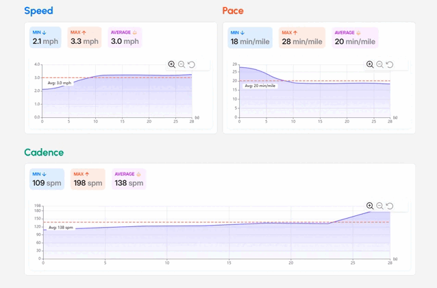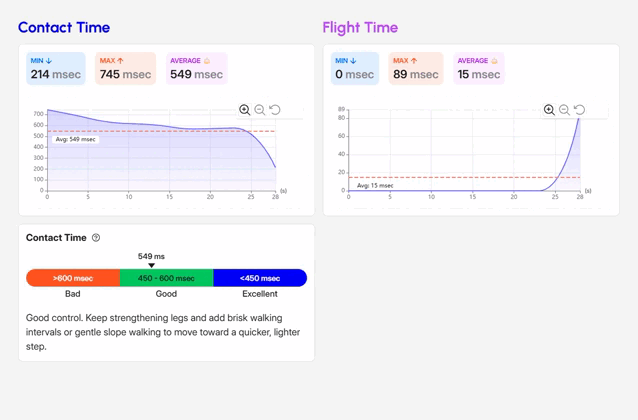 Mechanics explain how that output is produced. Contact time averages 549 ms and footstrike is heel strike. Stride time averages 450 ms and stride length averages 2.4 ft, a combination that matches quick step rhythm with moderate step length. Together, cadence, stride time, and contact time summarize the session’s locomotor timing strategy.