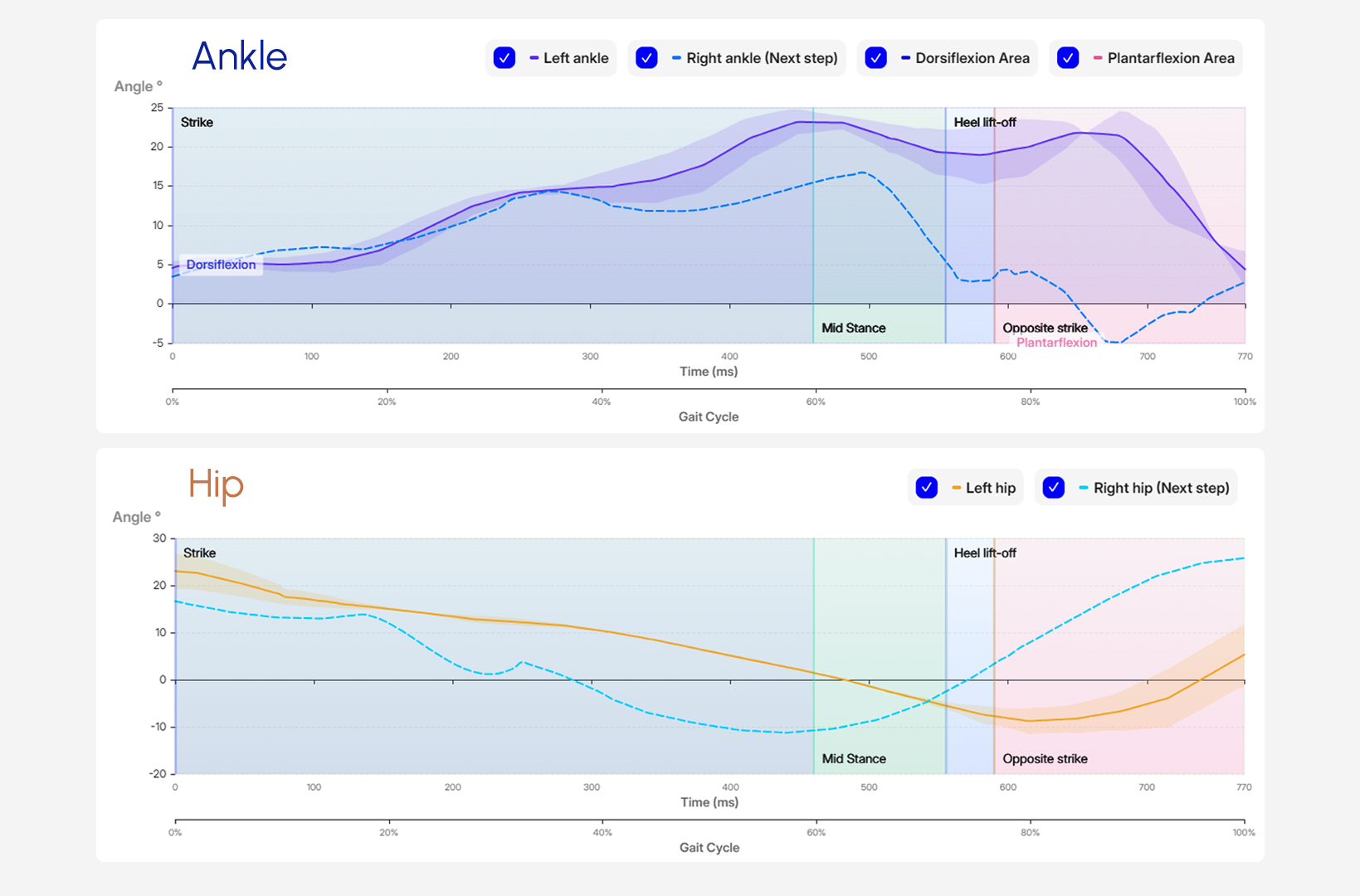 Joint-angle trends help connect “what” to “why.” The report highlights left ankle and hip patterns: the left ankle angle ranges from 4.59 degrees to a peak of 23.19 degrees, returning to 4.41 degrees by the end of the cycle. The left hip angle decreases from 23.02 degrees to 5.32 degrees across the gait cycle, and a decline in posture angle is noted. In practice, patterns consistent with restricted hip extension often coincide with altered late-stance mechanics and compensatory trunk strategies.