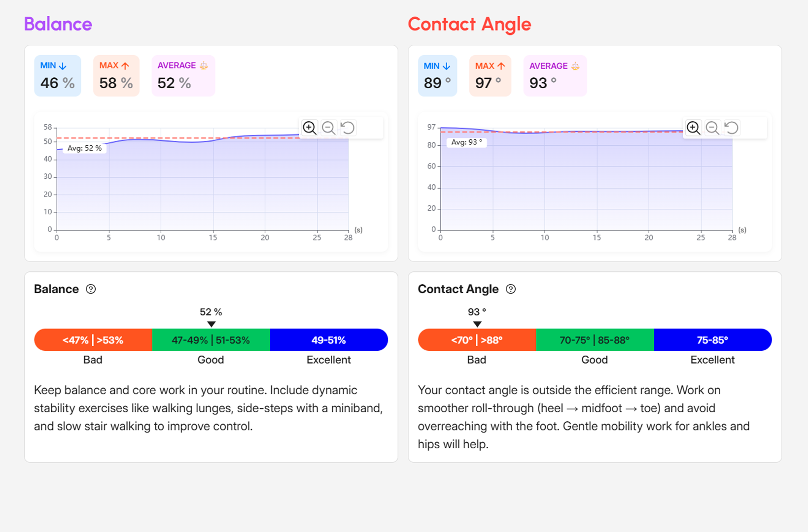 Stability and efficiency indicators provide the most actionable leverage. Balance averages 52% (near-symmetry with a slight right-side bias). Contact angle averages 93 degrees, a pattern interpreted within AiKYNETIX as potential overreaching/braking—an opportunity to refine step placement and encourage a smoother heel-to-toe roll-through.
