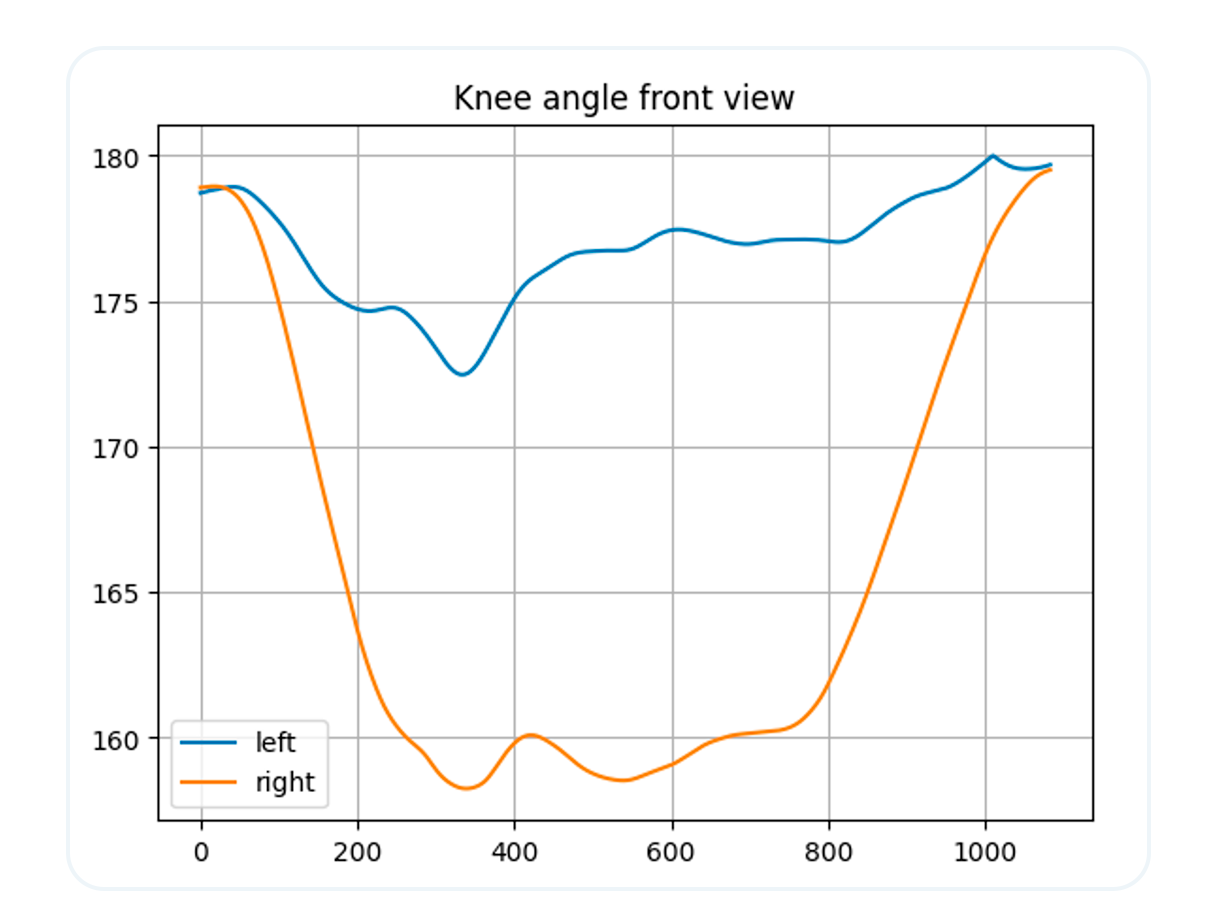 📊 Front-View Knee Angles – Ideally, the graph should show lines close to 180°, reflecting straight legs without valgus (knees caving in) or varus deviations.