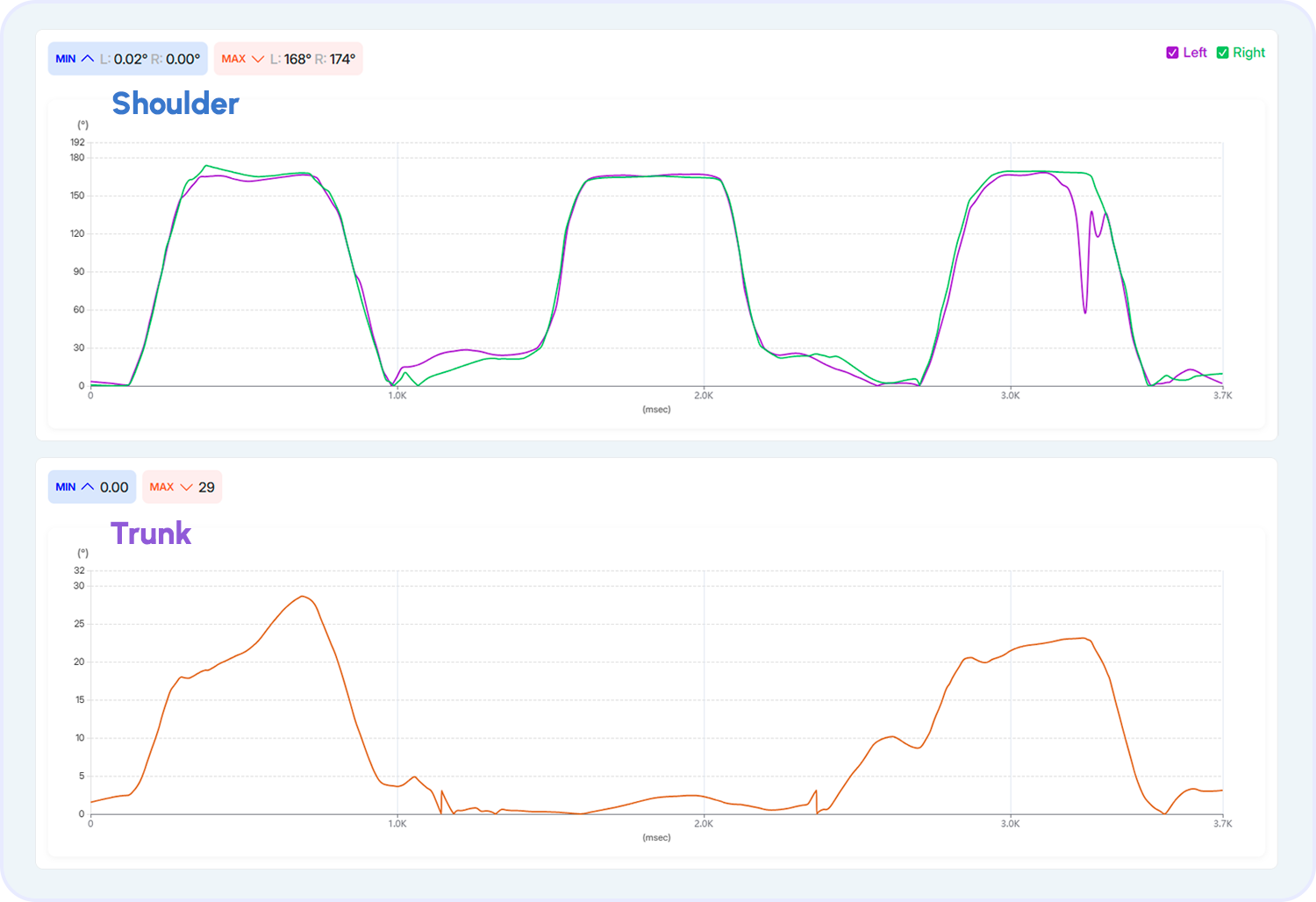 📊 Hip Flexion Angles – The left and right curves should overlap. Optimal maximum hip flexion is between 90° and 130°. If one side is limited, it indicates asymmetry or mobility restriction.