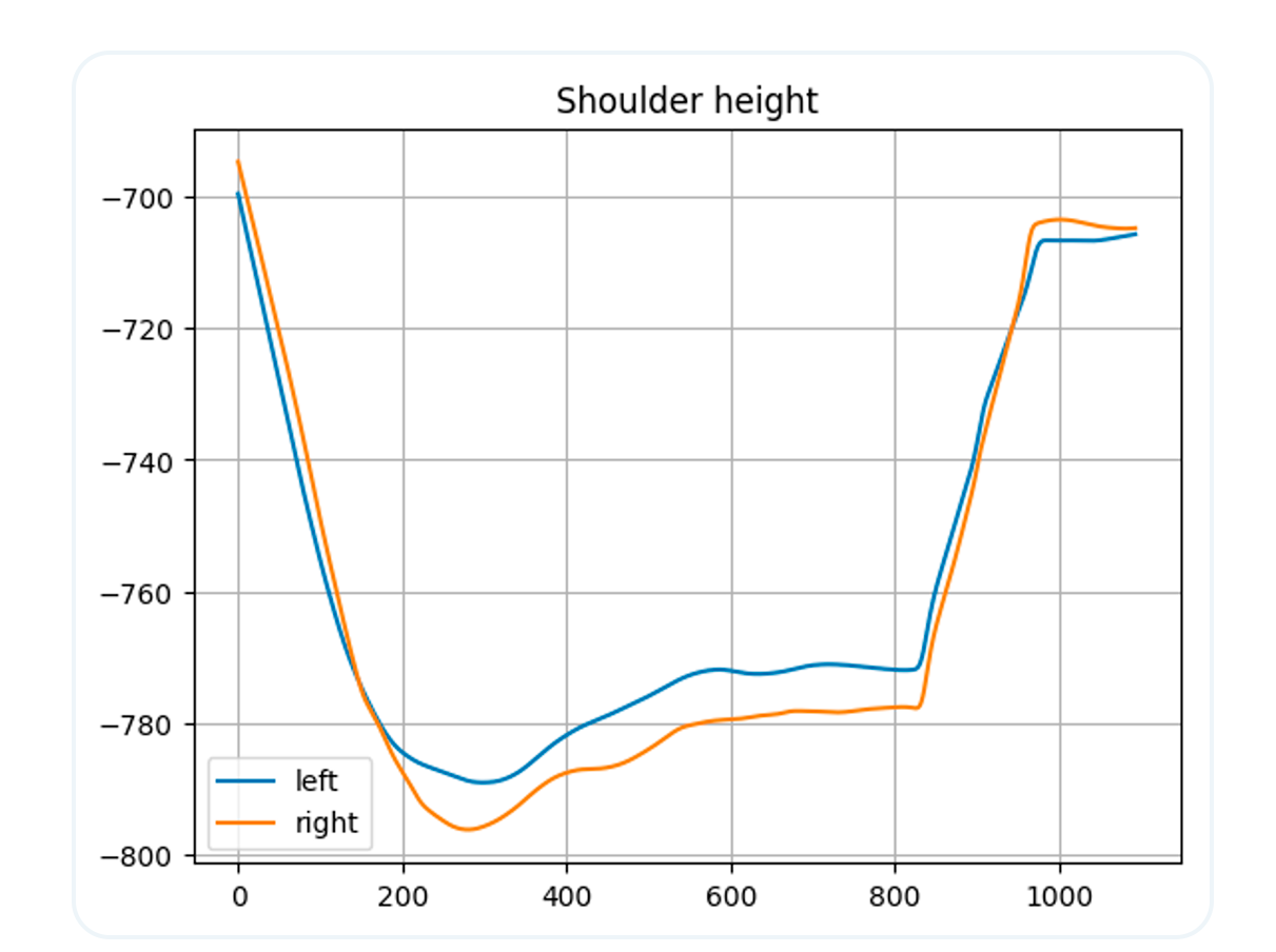 📊 Shoulder Height Symmetry – Both shoulders should remain level throughout the squat. Separation of the lines indicates compensations in the trunk or shoulder mobility.